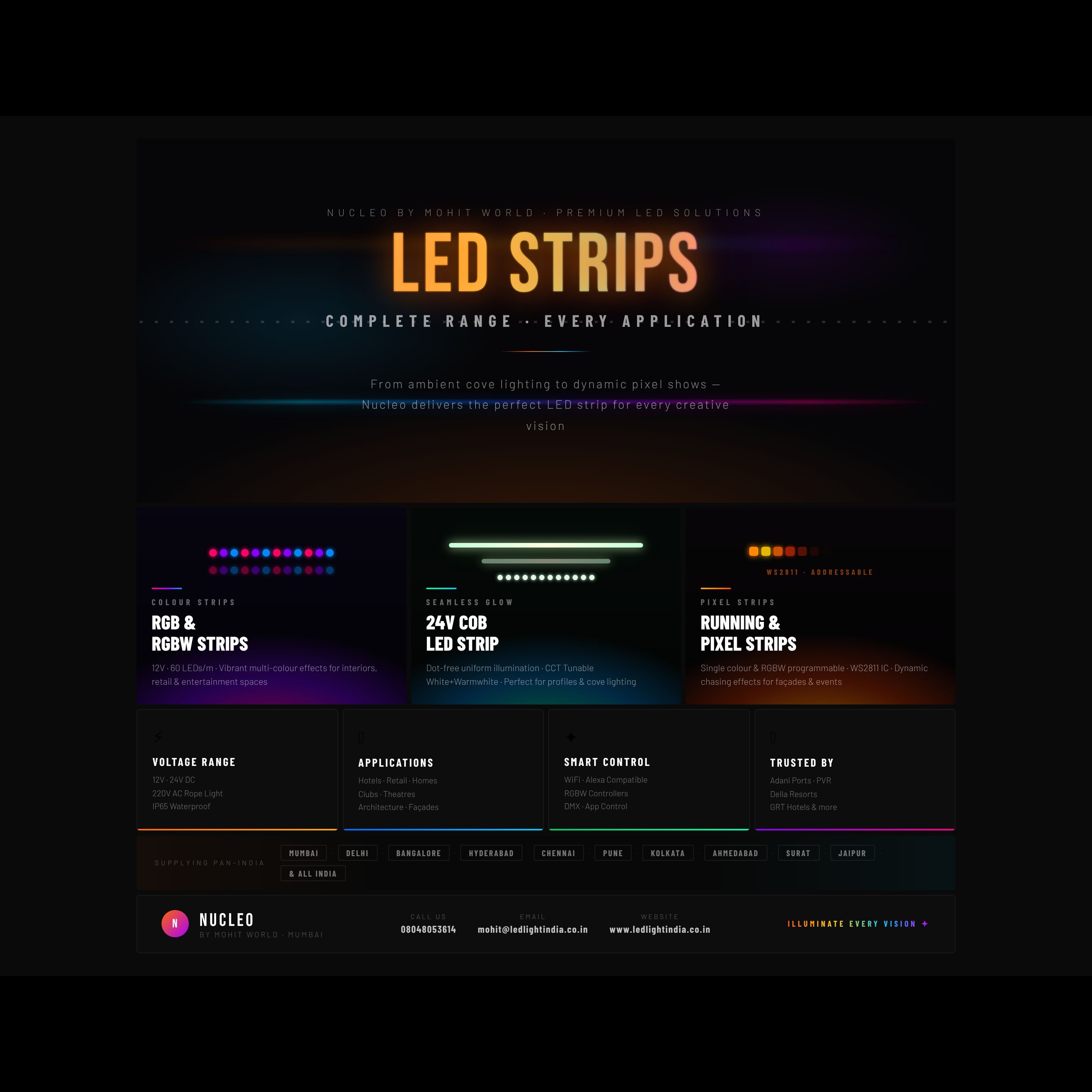 Whether you're an architect, interior designer, contractor, or creative professional β Nucleo strips are the go-to choice for hotels, retail stores, home theatres, clubs, residential projects, and large-scale architectural installations.